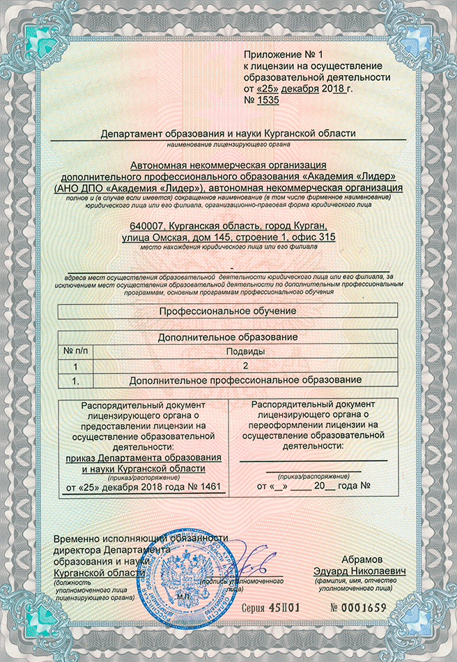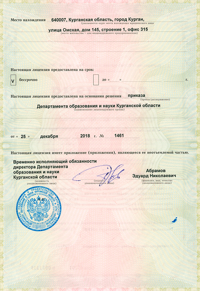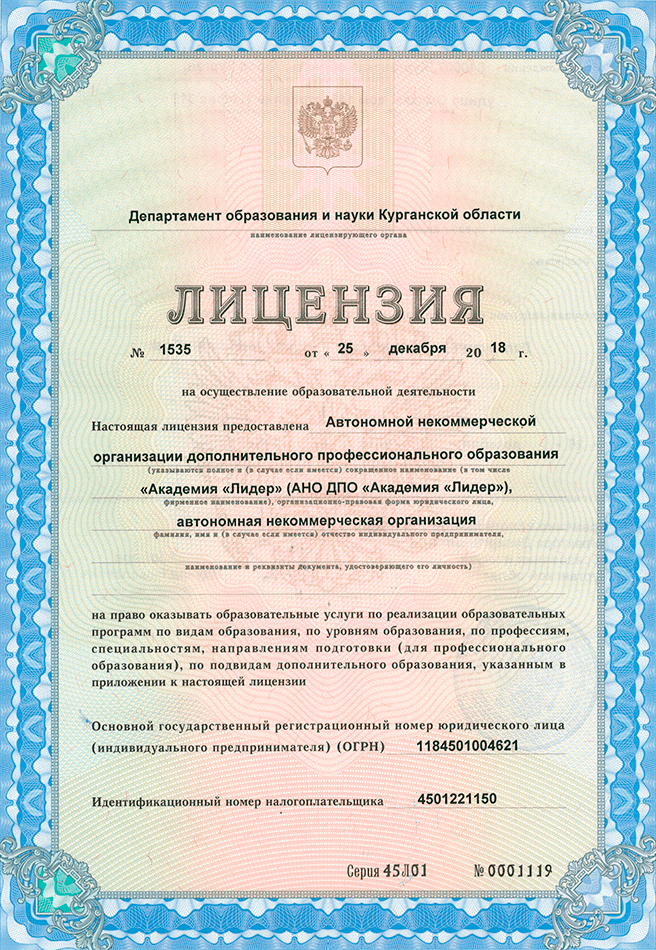 Лицензия №1535 на осуществление образовательной деятельности получена 25.12.2018